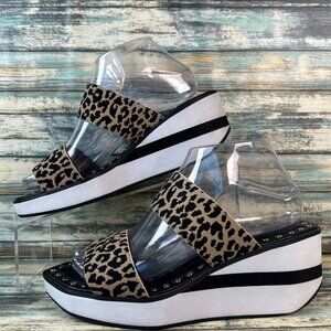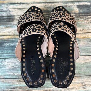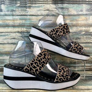 Cecelia NY Slide Sandals Brown Leopard Fabric Wedge Heel Studs Dress Casual 8.5M