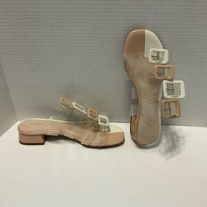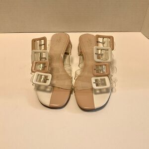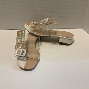Gorgeous NWOT Cecelia New York “Lincoln” clear and tan and white colorblock sandals. 6.5. Manmade upper - 4 adjustable buckled straps. Leather lining, 1 1/4” two tone block heel. Lining is just starting to lift at right heel. Not noticeable at all