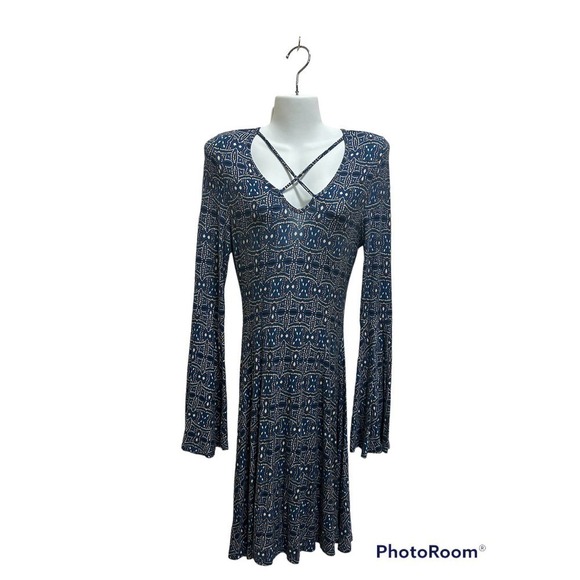 Cecico Dress Blue Criss Cross Front Bell Flare Sleeves Rayon Blend Boho.