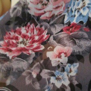 Lovely semi-sheer chiffon - gray background w delicate blossoms - shades of pinks & blues w white swirls on black. Exceptionally well made - quality fabric & tailoring - open v-neckline w satin frog closure - swing style open flowing front w asymmetrical hemline - wide sleeves