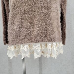 Cecico Taupe Fuzzy Chenille Knit Sweater with Cream Lace Hem NWT Women's Large