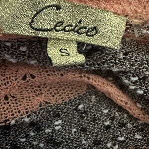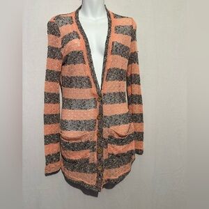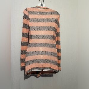 Featuring: stylish peach and gray striped pattern, cozy knit is perfect for layering,