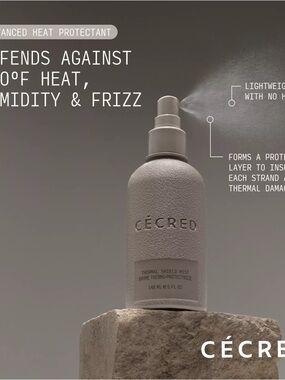 Take the heat - all 450°F. Meet your prep step for any heat style. Cécred Thermal Shield Mist is an advanced, lightweight heat protectant spray that shields hair from 450°F/232°C heat styling, humidity, pollution, and frizz, leaving hair soft, shiny, and weightless.