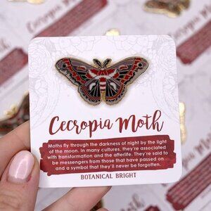 This is a high-quality and well-detailed enamel pin of the Cecropia Moth. There are two clasps on the back for securing the pin and preventing rotation. Each Pin is about 1.85" inches wide and is packaged on its own meaning card. The pin and meaning card are further packaged in a clear plastic sleeve. The base metal is zinc alloy and is plated with gold. This is a Grade A Pin, the highest grade awarded to pins, meaning that it doesn't have any noticeable flaws.