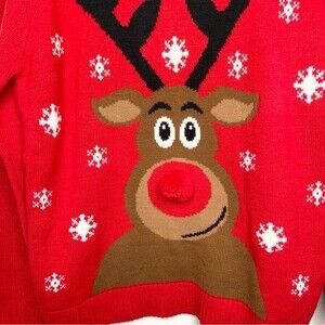 Cedar Wood State Holiday Rudolph Christmas Sweater, pom pom nose detail
