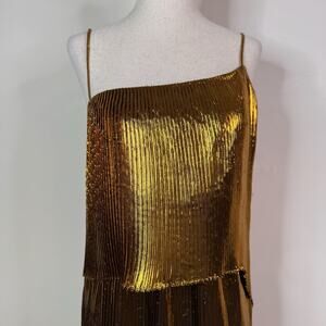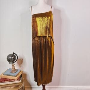 Cedric Charlier Gold Metallic Pleated Lamé Midi Dress Asymmetric Size 6 Goddess