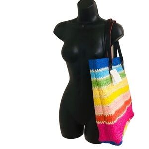 Cee Klein Rainbow striped straw jute beach summer island bucket tote bag new