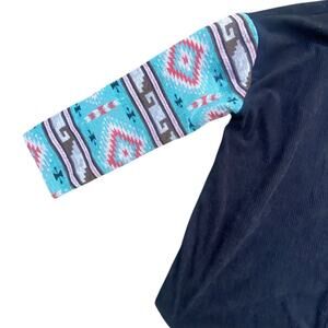 Stand out in this unique Ceelo Creation women’s medium button-up jacket/shirt featuring a soft black corduroy body with bold turquoise, red, and brown Aztec print knit sleeves and matching front chest pocket. Fully lined for comfort, with a collared neckline and button front closure. Perfect for layering with jeans and boots for a Western, boho, or festival-inspired look.
