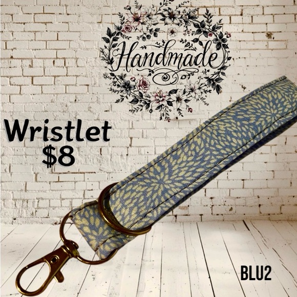 Stylish wristlet with a blue and yellow pattern. Features a convenient clasp.