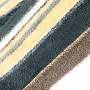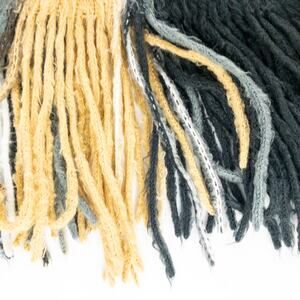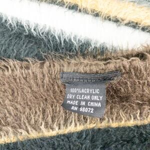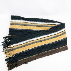 Features & Color & Closure: Brown, black, white, and mustard-gold stripes; tasseled fringe ends; fuzzy soft texture