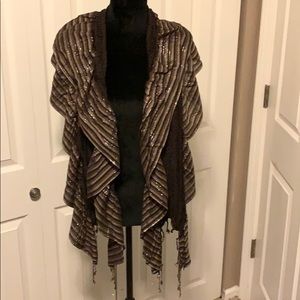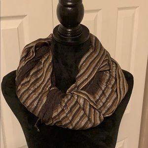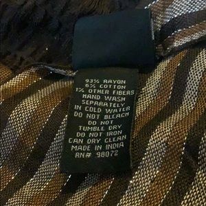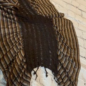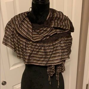 Cejon Chocolate Brown Ruffle Scarf. Soft, versatile, lightweight. Made of 93% Rayon, 7% Metallic Yarn. Measures 54 inches by 16 inches. Inner dark brown measuring 6.5 inches wide. Various shades of brown make this an easy scarf to pair with ensembles. Previously loved, good condition.