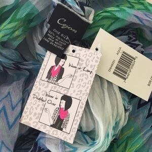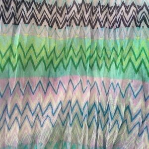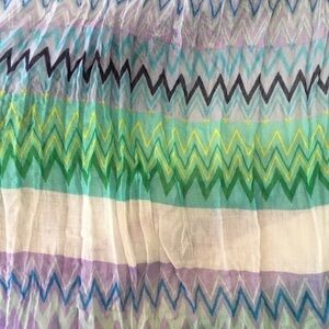 Cejon Zigzag Infinity Scarf. Gauzy crinkled material made of 100% Polyester. Multi Color zig zag patterned: lilac, white, sea foam, navy, periwinkle, green, yellow and turquoise. Measures approximately 34" wide when laying flat, and 46" long. Handwash, lay flat to dry.