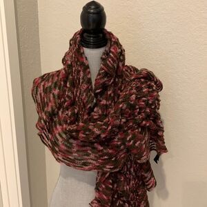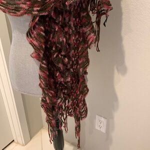 Pretty Cejon scarf is mauve, cranberry and brown. Frilly design. String ends. Width is 15”. Length is 66”.