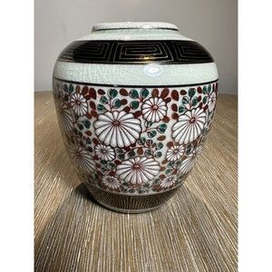 This is a beautiful, unique vase with a light green celadon background, a band of black and gold design painted around the top and bottom, and a design of chrysanthemum flowers and leaves in white, red, green and gold painted all around the middle. Theres intentional crazing that is typical of celadon porcelain pieces. This vase is marked "九 谷"/"Kutani" and "Japan" in red.
