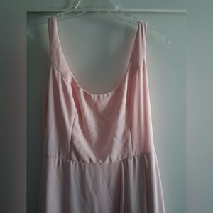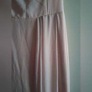 this dress is absolutely beautiful it is fully lined has a front slit a back zipper closure light powder pink the colorway is called ballet gently worn no holes tears or stains!