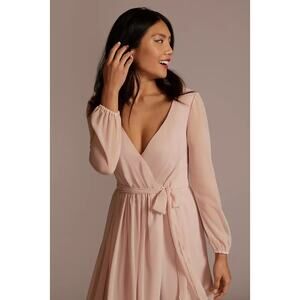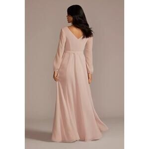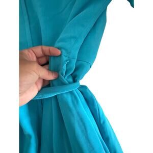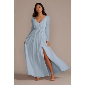 Stunning teal blue maxi dress by Celebrate DB Studio (Sold at David’s Bridal) perfect for weddings, formal events, or evening occasions. Features a flattering V-neckline, long sleeves with elastic cuffs, a flowing chiffon skirt, and a matching waist tie for a cinched silhouette. Hidden back zipper closure. Fully lined for comfort.