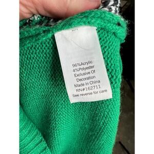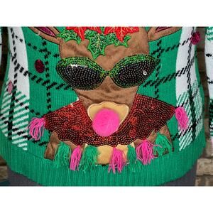plaid green white black sweater. with sequin antlers, collar and sunglasses. 3d pink pompom nose, and tassels.