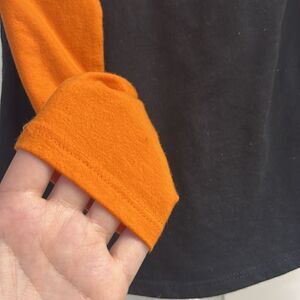Crewneck orange and black baseball shirt with glittered white skull and crossbones topped with pink roses