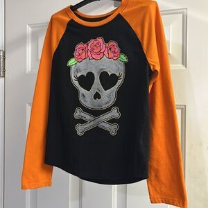 Celebrate Halloween Glitter Skull w/ Cross Bones and Roses Baseball Shirt- 7/8