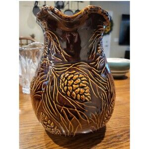 This rare and highly sought-after Celebrating Home pitcher features a beautiful pinecone pattern on a glossy brown stoneware material. The pitcher has a height of 10 inches and a width of 9 inches from spout to handle, making it a perfect addition to any American-themed kitchen. The pitcher also has a handle for easy pouring and is an original piece, not a licensed reproduction. This item is in very good used condition and will make a great addition to your decorative cookware, dinnerware, and serveware collection. The Celebrating Home brand is known for its high-quality products, and this pitcher is no exception. Whether you are a collector or simply looking for a unique piece to add to your kitchen, this Celebrating Home pitcher is a must-have.