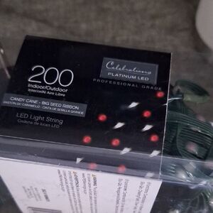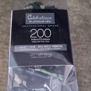 Celebrations Platinum LED light string with candy cane design. Features 200 indoor/outdoor lights. Red and White alternating.