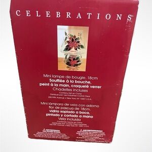 Beautiful vintage glass candle holder with poinsettia design. Features vibrant red and green colors. Perfect for holiday decor. New in box never opened.