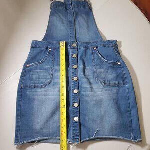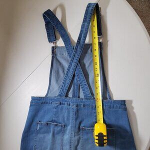 Stretch denim (45cotton/30poly/23rayon/2spandex) skirtalls with adjustable straps, zip open bib and button front skirt - see all pics for measurements and condition - no issues - has raw hem- weighs 1lb1oz - made in China -machine washable