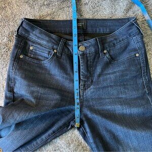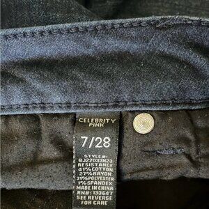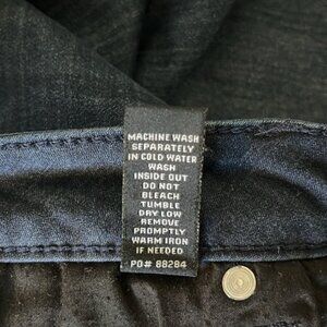 Very comfortable. A dark wash classic featuring a whiskered lap and frayed ankle openings. Super stretch for flattering fit. Traditional 5 pocket styling.