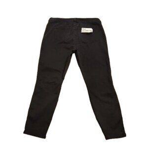 Black denim ankle skinny jeans. High-waisted. Single button and zipper front closure. Stretchy. Features 2 sporty stripes down each leg. Two front faux pockets. Single coin pocket. Two back pockets.