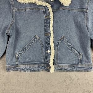 Design: Cropped denim trucker silhouette with plush sherpa/faux shearling collar and sherpa-trimmed front placket