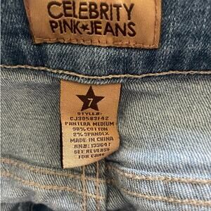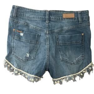Celebrity Pink Juniors Jean Shorts Size 7 Blue Distress PomPom Fringe Hem Denim
