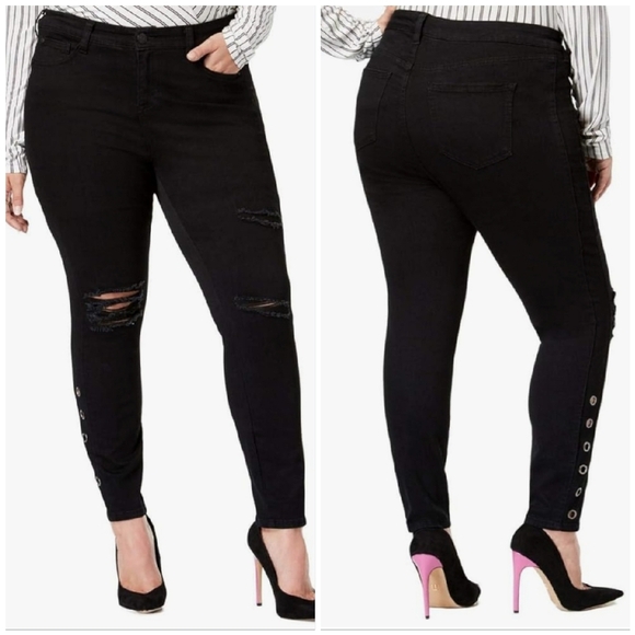 black jeans, ankle jeans, distressed jeans, grommet detail, edgy fashion, mid rise jeans, stretch denim, fall fashion, skinny jeans, rocker style, grunge, Celebrity Pink jeans, Y2K aesthetic, trendy pants