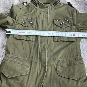 Celebrity Pink Olive Green Utility Jacket with Rhinestone Pockets, size medium. In great used condition. Has drawstring waist. Zip up and button up. Super cute jacket. See pictures for measurements and fabric content.