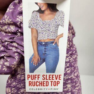 Celebrity Pink Womens Purple Puff Sleeve Ruched Top With Floral Print Size L