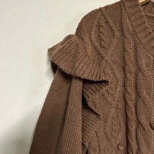 This is a brown, cropped, Swiss dot, cableknit button front sweater with ruffle accent at shoulders. This sweater has some stretch to it.
