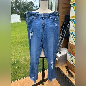 These blue jeans from Celebrity Pink feature a trendy ankle-cropped design with a stylish distressed finish. The medium-wash denim offers a comfortable stretch, making them perfect for casual outings. The frayed hem adds a touch of modern flair to your wardrobe.