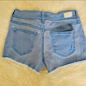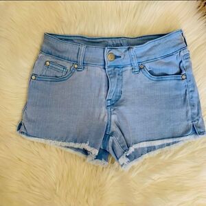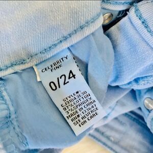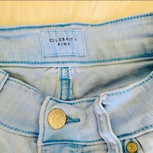 Cute baby blue denim shorts. 5 pocket. Button/zip fly. Frayed legs. Stretch denim. No flaws. Celebrity Pink Size 24