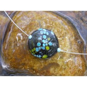 Black with Blue & Green Spots Lampwork Disc Beaded Necklace. This necklace features a black with blue & green spots disc lampwork bead. Beautiful marbling with green and blue highlights. Tiny blue seed beads border the focal bead. All sits on a thin metal wire.
