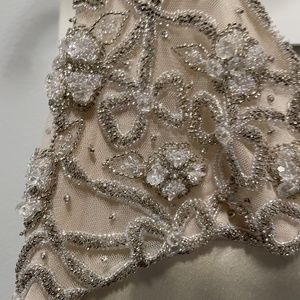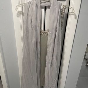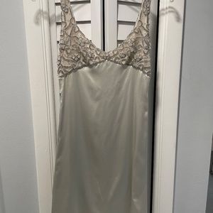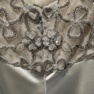 One of a kind handmade dresses with beading. 37" long , busy is 26 champagne and silver. The dress comes with a long silk shawl with small rhinestones. the shawl adds the final touch and id so elegant. The dress is absolutely stunning for a wedding or special occasion black tie affair or New Years Eve. Or just an elegant evening with a sexy dress.