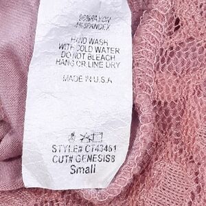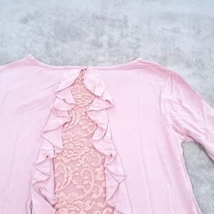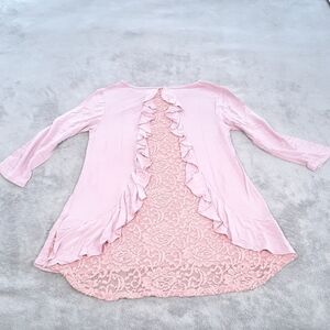 Celeste lace back with ruffles is in gently worn condition. Color is pink. 96% rayon and 4% spandex. Pit to pit is 16", shoulders are 14", length is 25", and the sleeves are 12".