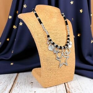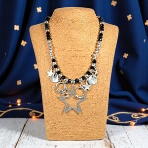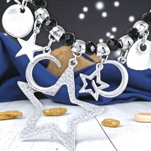 Get ready to sparkle like the night sky β¨π with this captivating Turkish artisan necklace, meticulously handcrafted from high-quality silver-toned zamak. This celestial beauty features a bold open star pendant (2.5") surrounded by a constellation of smaller star and crescent moon charms, each carrying a rustic yet chic hammered finish. Black faceted stones alternate with smooth silver beads for a striking contrast, while the length (20.5" + 2" extender) ensures it drapes beautifully over any neckline. Made in Turkey by expert artisans, itβs hypoallergenic, nickel-free, and designed to be tarnish-resistant β so it will keep shining for years. Perfect for adding boho-chic flair to everyday looks or making a statement at your next special event.
