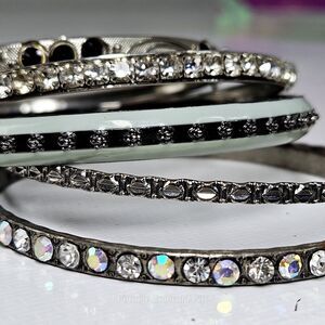 Keywords: Celestial Bangles Set, Mixed Enamel Rhinestone Bracelets, Silvertone Sparkle Bangle Set, Boho Chic Bracelet Set, Aurora Borealis Rhinestone Jewelry, Cosmic Style Bangles