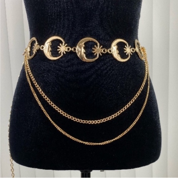 Celestial Crescent Moon Multi Layer Chain Statement Belt Metal Waist Belt Gold