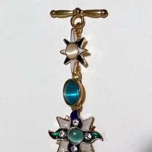 blue, green and cream color accenting it. 2 blue cats eye stones - 1 on either