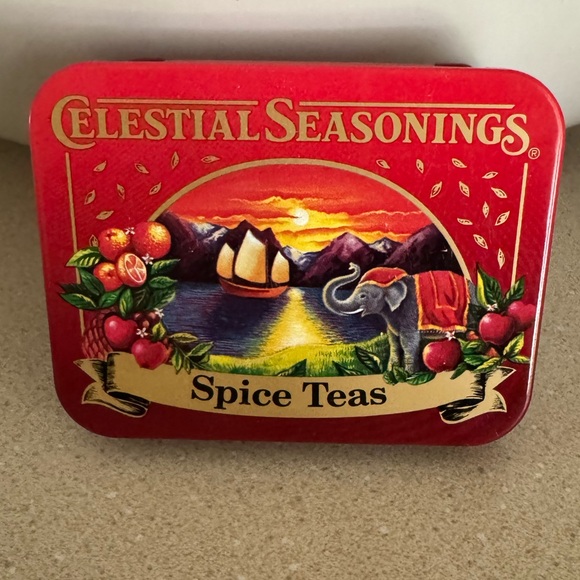 Vintage Celestial Seasonings Spice Teas tin. Good condition, a few small scratches shown. This is the small size tin.