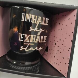 Celestial Stars Mug Set 16oz, Black With Gold Print Reads "Inhale Sky Exhale Stars" & Pink With Gold Print Reads "Written In The Stars" .