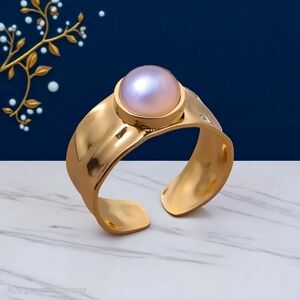 Make a bold and magical statement with this eye-catching celestial-inspired ring 🌙✨ Featuring a wide hammered band in radiant 18K gold plated stainless steel, it’s crowned with a luminous faux pearl that glows with soft iridescent hues. The design evokes a dreamy moonrise—powerful, elegant, and truly unforgettable. Adjustable to fit most fingers, this piece is perfect for adding a luxe touch to any outfit, day or night. Wear it solo or stacked for a celestial goddess vibe! 💫