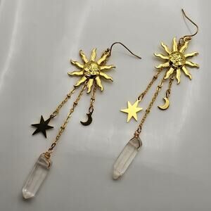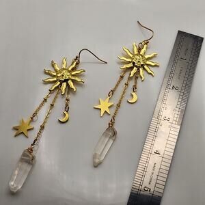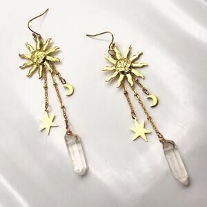 Golden metal sun, star, and moon earrings with dangling quartz crystals. Natural crystals vary in shape and size.