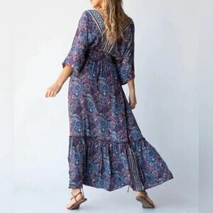 Silky Celia is ready to throw on and go for a simple lunch with friends, but ready in seconds for a special occasion! This maxi kimono dress isn't short on details with the double v-neck, wooden buttons, and a gorgeous boho border around the neckline that flows down to the hem! Details don't stop at the ruffled hem with a slit up the middle! Classic kaftan styling with the comfort you crave!