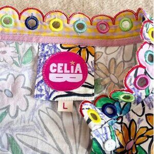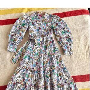 CeliaB Oliver dress! Cute button front midi dress made out of a pretty scribbled painterly floral fabric. Features tiered silhouette, long balloon sleeves with button cuffs, scallop trim with embroidered embellishments, and matching tie self-belt. 97% cotton/3% spandex. Excellent used condition with no visible flaws. Size large. Approx measurements: pit to pit 19”, waist 16”, hips 22”, length 46”. For fans of sustainable labels like: rhode, pomander place, hyacinth house etc.